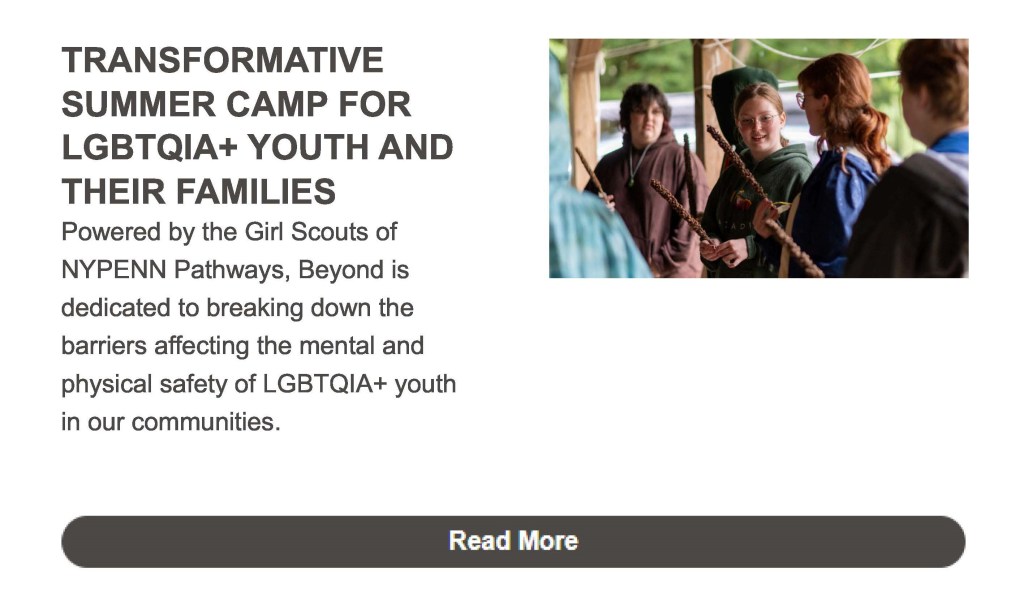 “She’s been attending a more established camp … for 4 years and absolutely loved yours even more. The other camp is entirely LGBT+ folx but they want to run a ‘typical camp’ so have never held an affinity group. While I understand wanting to create a ‘kids can just be kids’ environment, I think it’s great Beyond Binary draws from the lived experiences of adults and other campers and taps into that openly. She loved being able to ‘ask any questions’ of (her counselor) in a judgment free zone.”